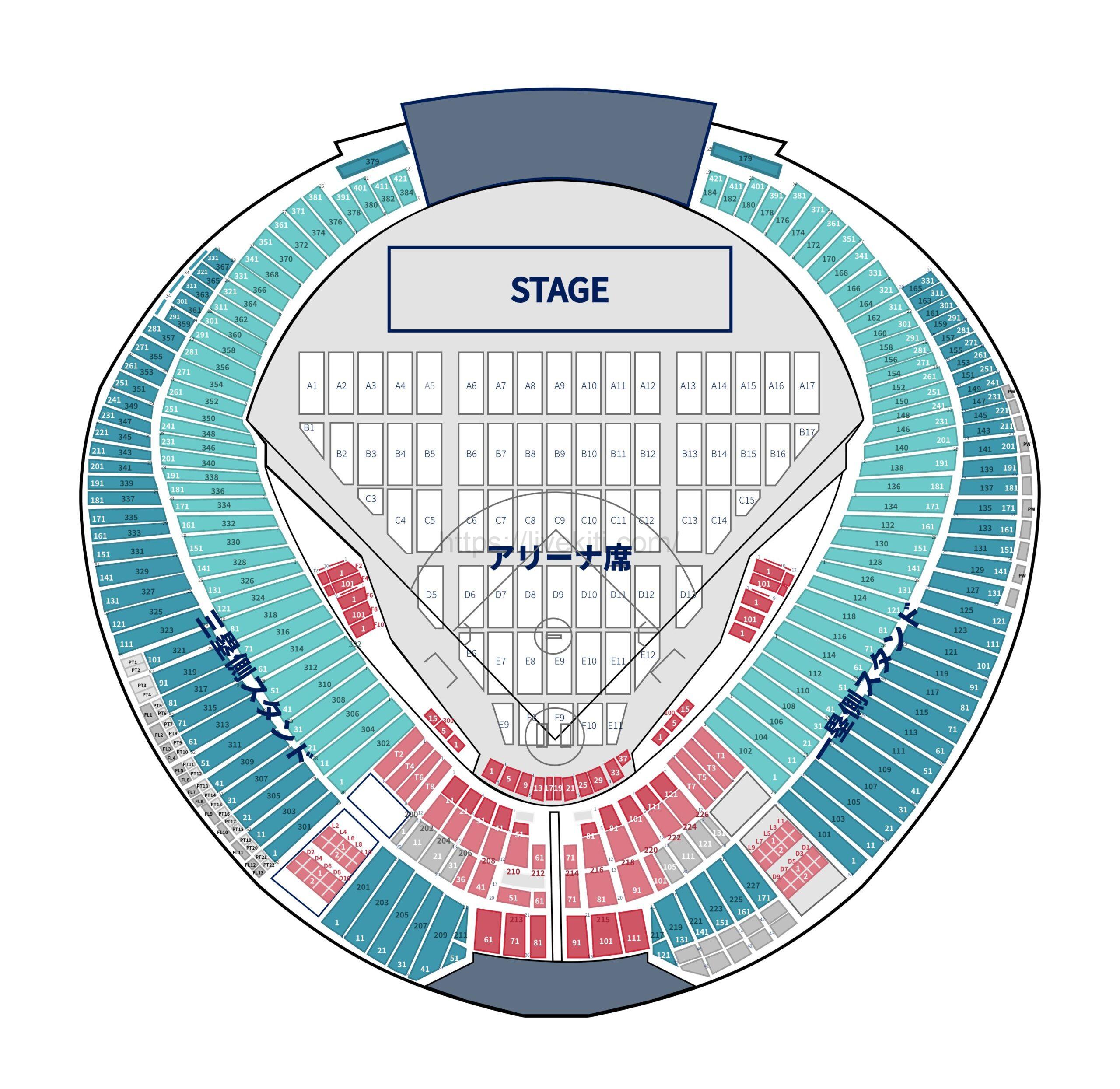 ベルーナドームでライブでライブが行われる時は、ステージを外野側に配置して、その前にアリーナ席が設置するのが、もっとも一般的な座席配置です。